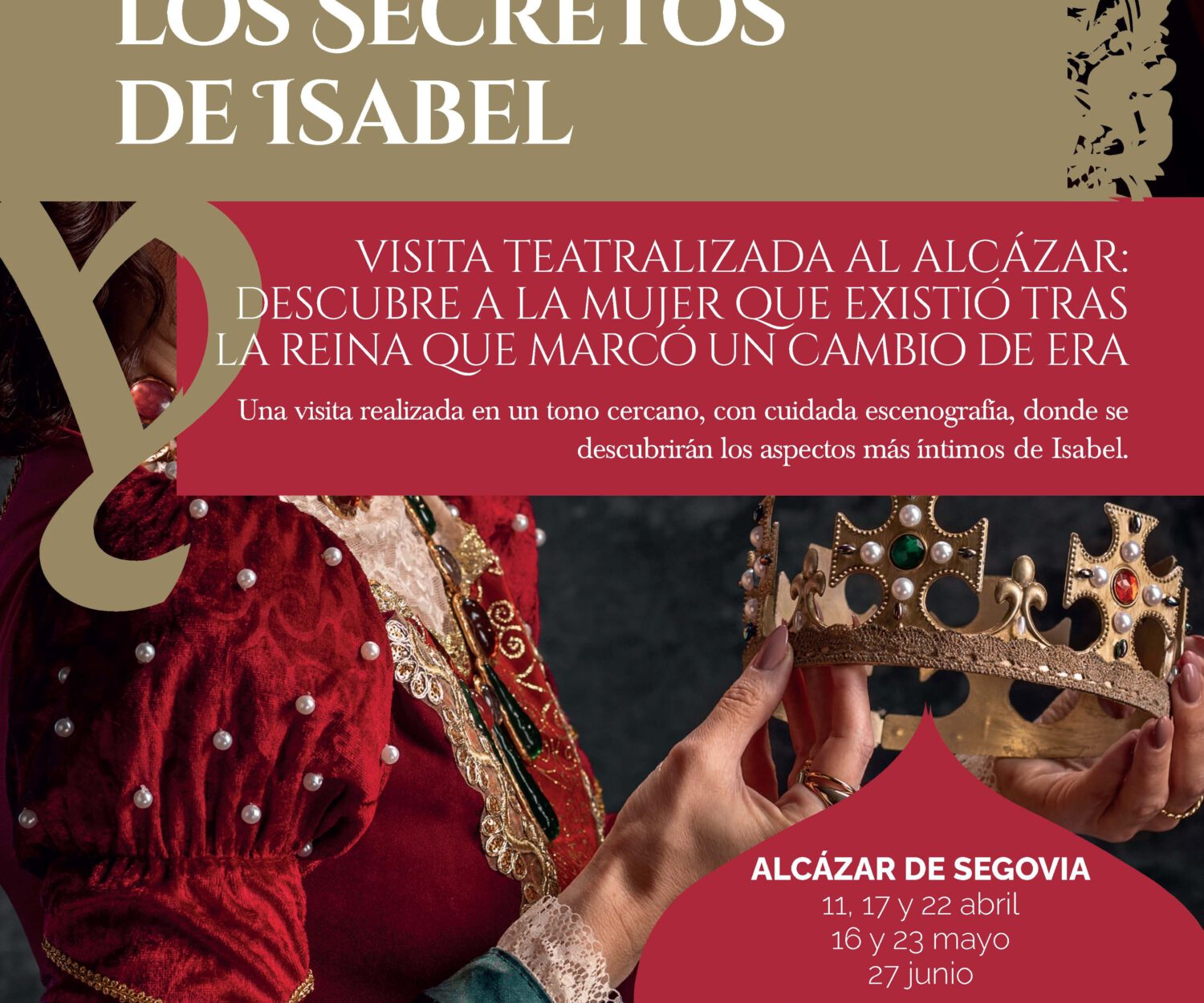 Actualidad 05 Abr 2025 Visitas teatralizadas: “Confidencias de una reina, los secretos de Isabel” Los asistentes podrán conocer no solo a la Isabel reina, aquella cuyo reinado cambió el mundo, sino también a la… Patronato del Alcázar de Segovia