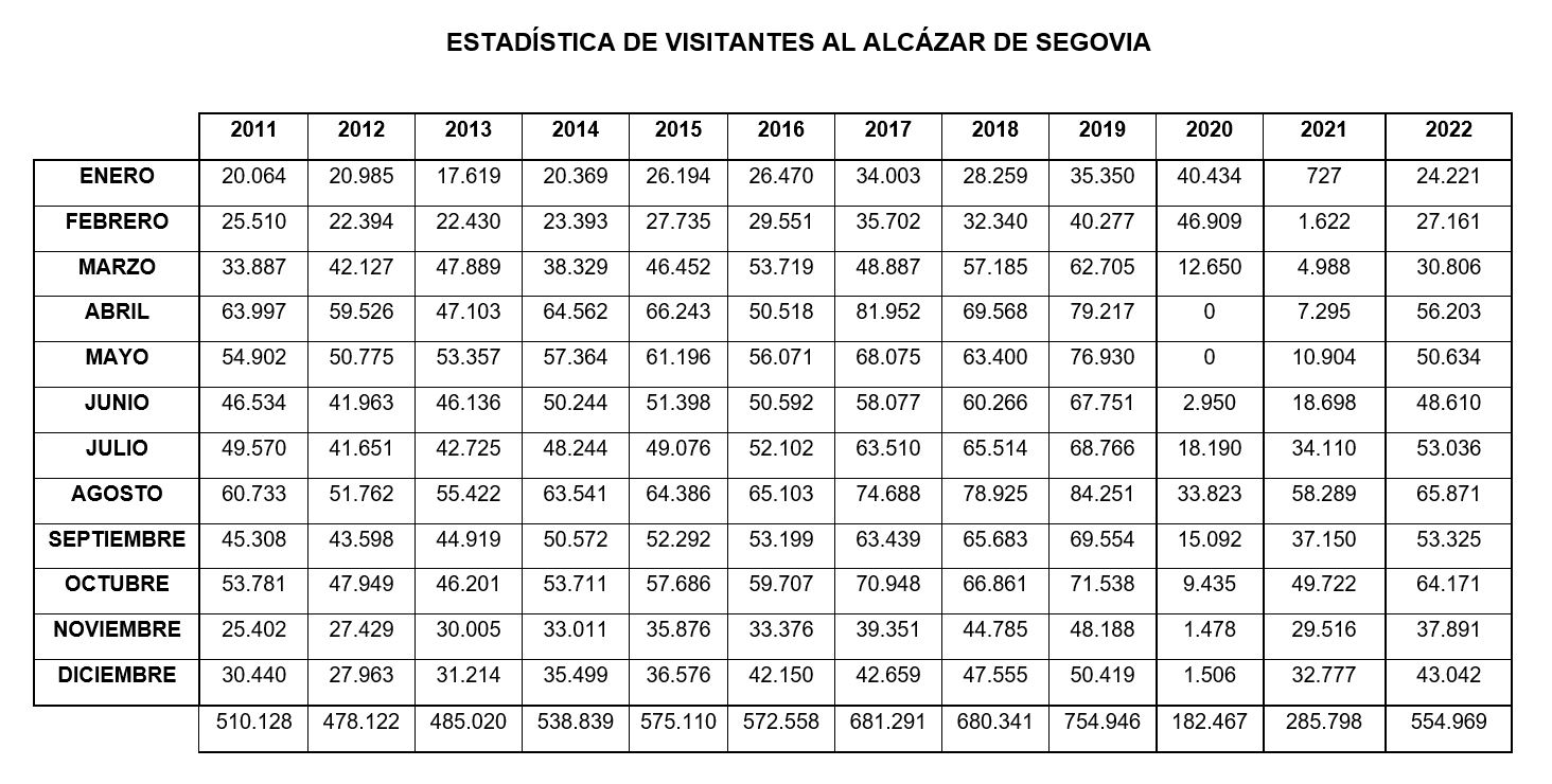 De nuevo el Alcázar de Segovia ha demostrado ser uno de los monumentos que más interés despierta entre los turistas. Durante el recién concluido año 2022 ha recibido un total de 554.969 visitas; en todos los meses se han superado las cifras registradas en el año anterior.