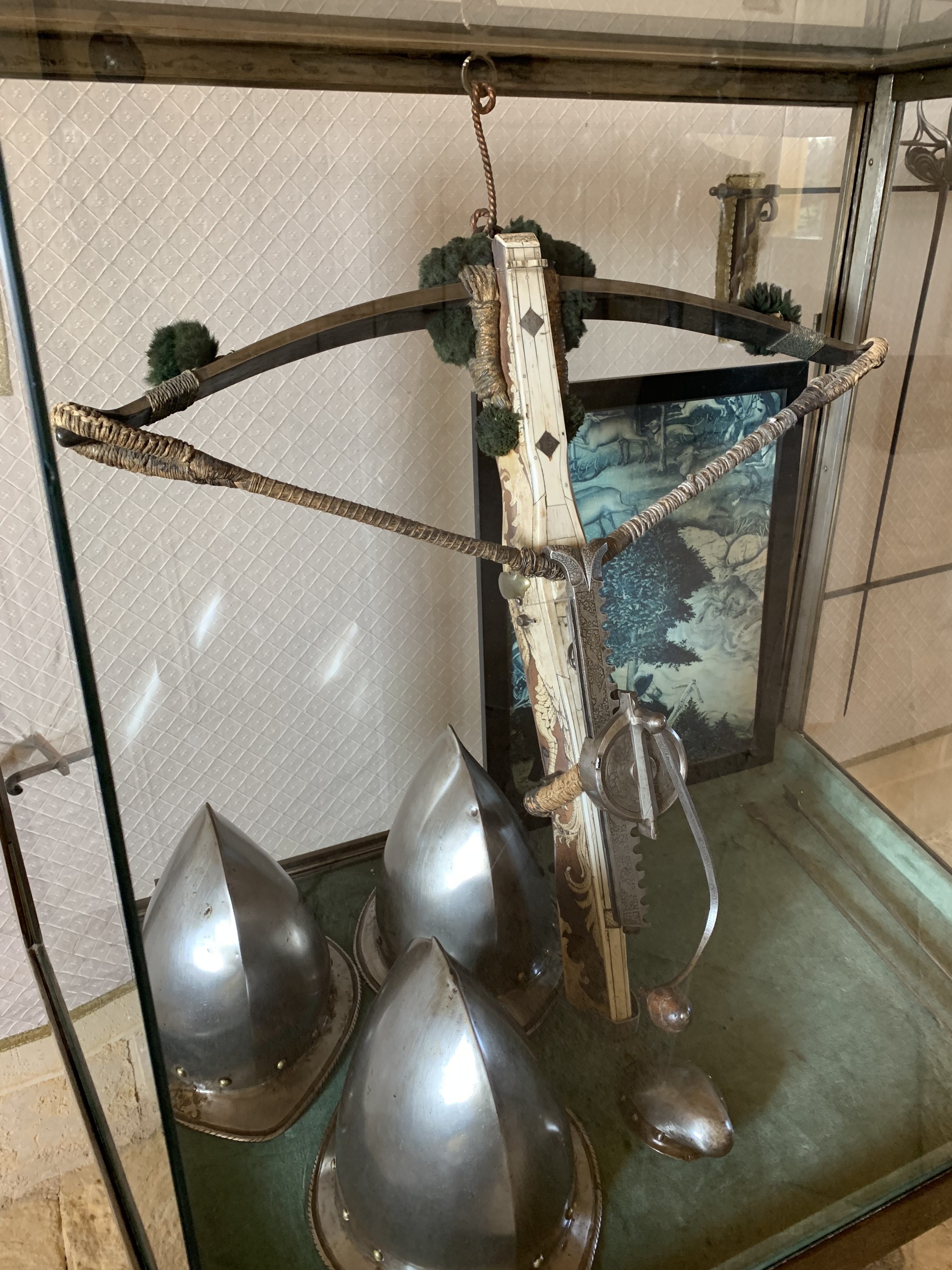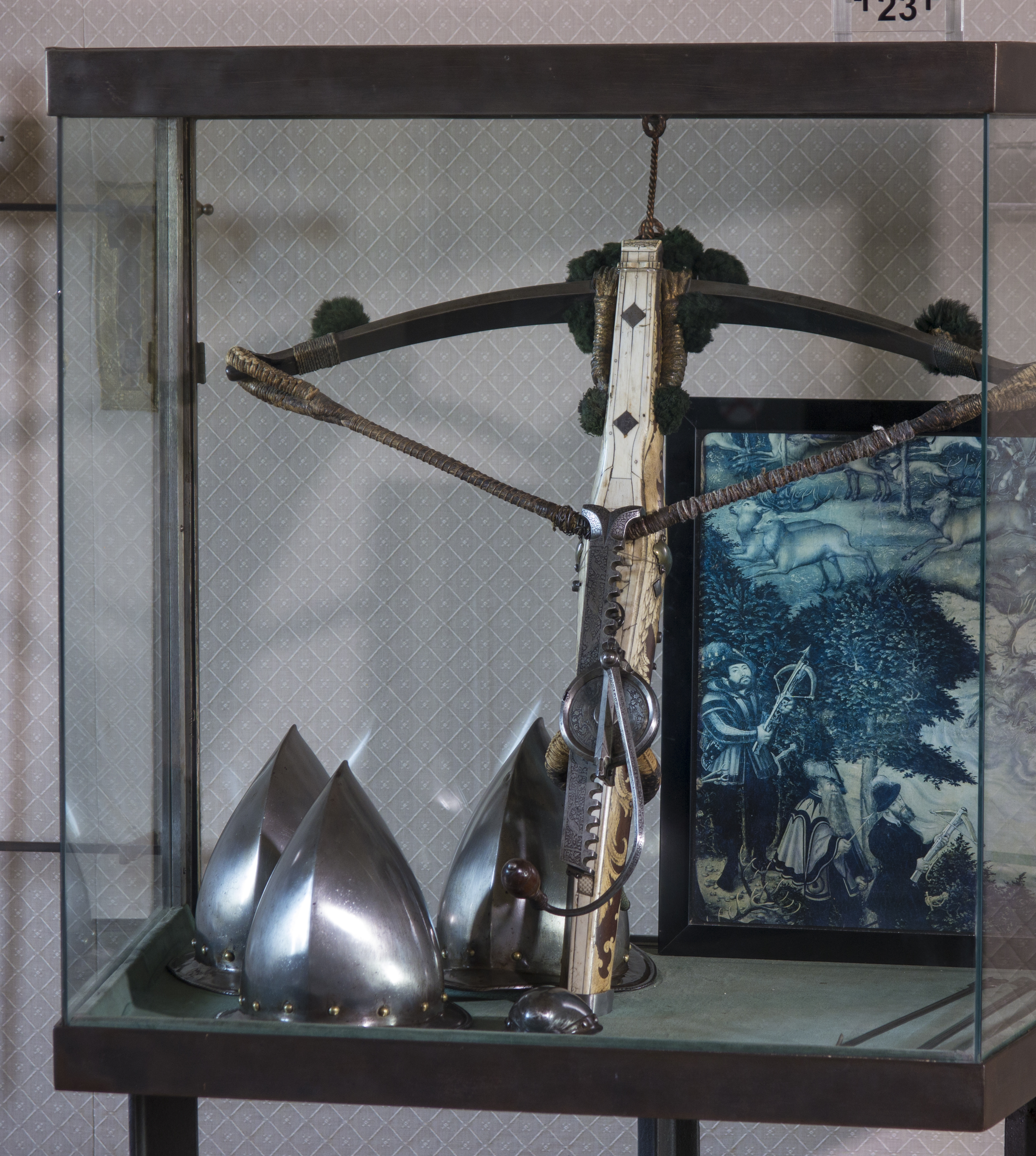 Ballesta alemana con cureña de madera decorada con incrustaciones de marfil en forma de águila bicéfala; verga y cranequín de acero, datada en 1572. Sus piezas están unidas mediante cordajes y tendones de animales. Al accionar la palanca del disparador, la rotación de la nuez libera el arco y dispara el virote.