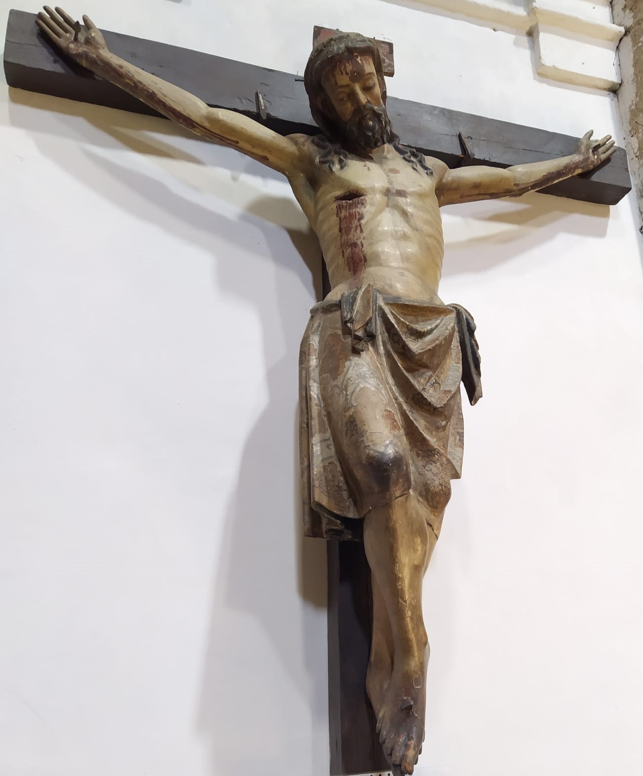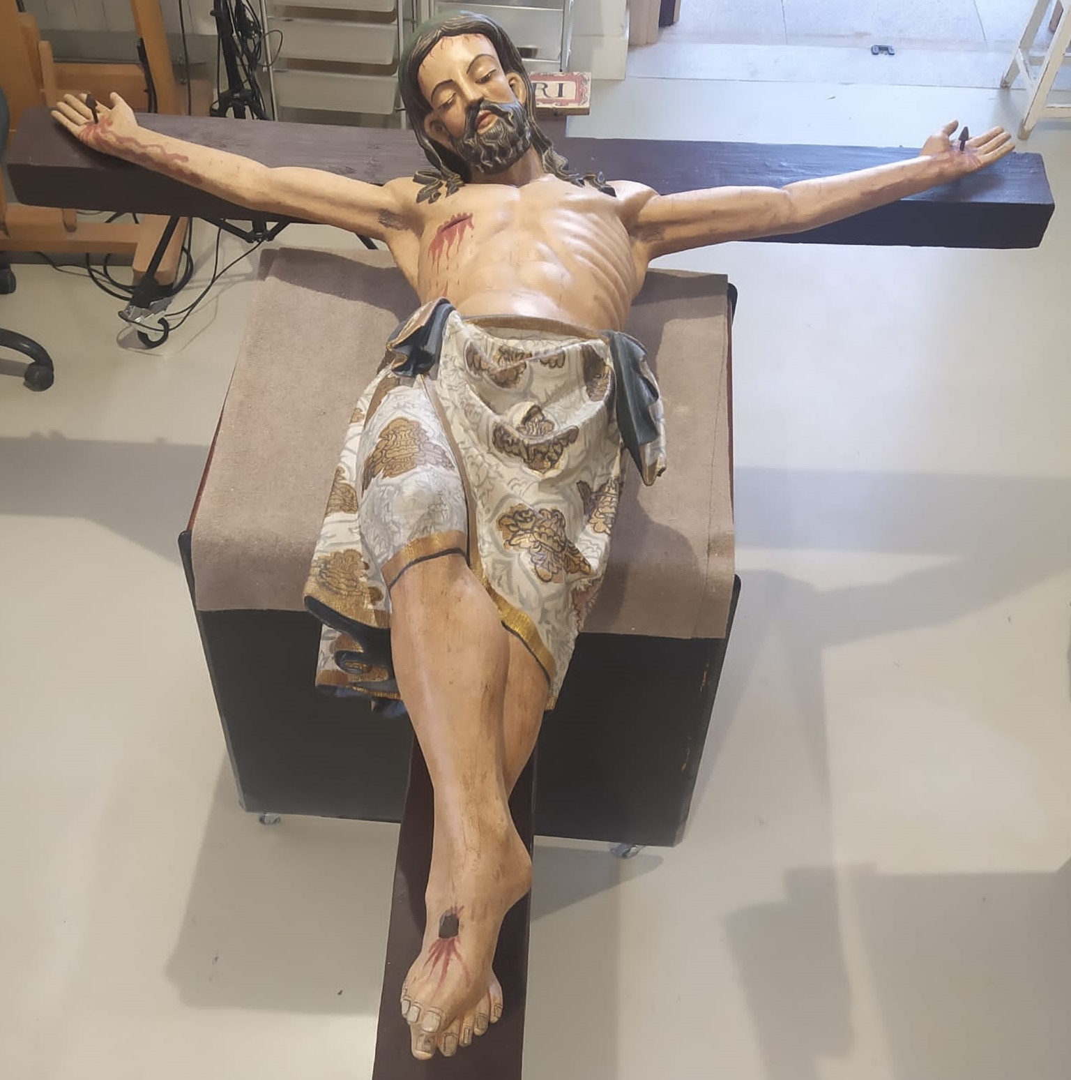 Durante dos años, las restauradoras del Alcázar, Ana Lourdes Blanco Díez y Milagros Torres Gete, han trabajado para devolver al Cristo Crucificado su esplendor original. El proceso comenzó en el año 2021, con la evaluación inicial de la obra en su emplazamiento habitual en el interior de la iglesia de San Miguel. Se realizaron diversas inspecciones visuales para documentar el estado de conservación y, mediante la realización de fotografías de alta resolución, se identificaron diferentes daños, acumulación de suciedad, así como áreas de repintado previo. Se tomaron muestras de materiales para análisis químicos y físicos, entre los que se incluía la microscopía óptica, con el fin de comprender mejor la composición y estructura de la obra original y los materiales de restauración previos.