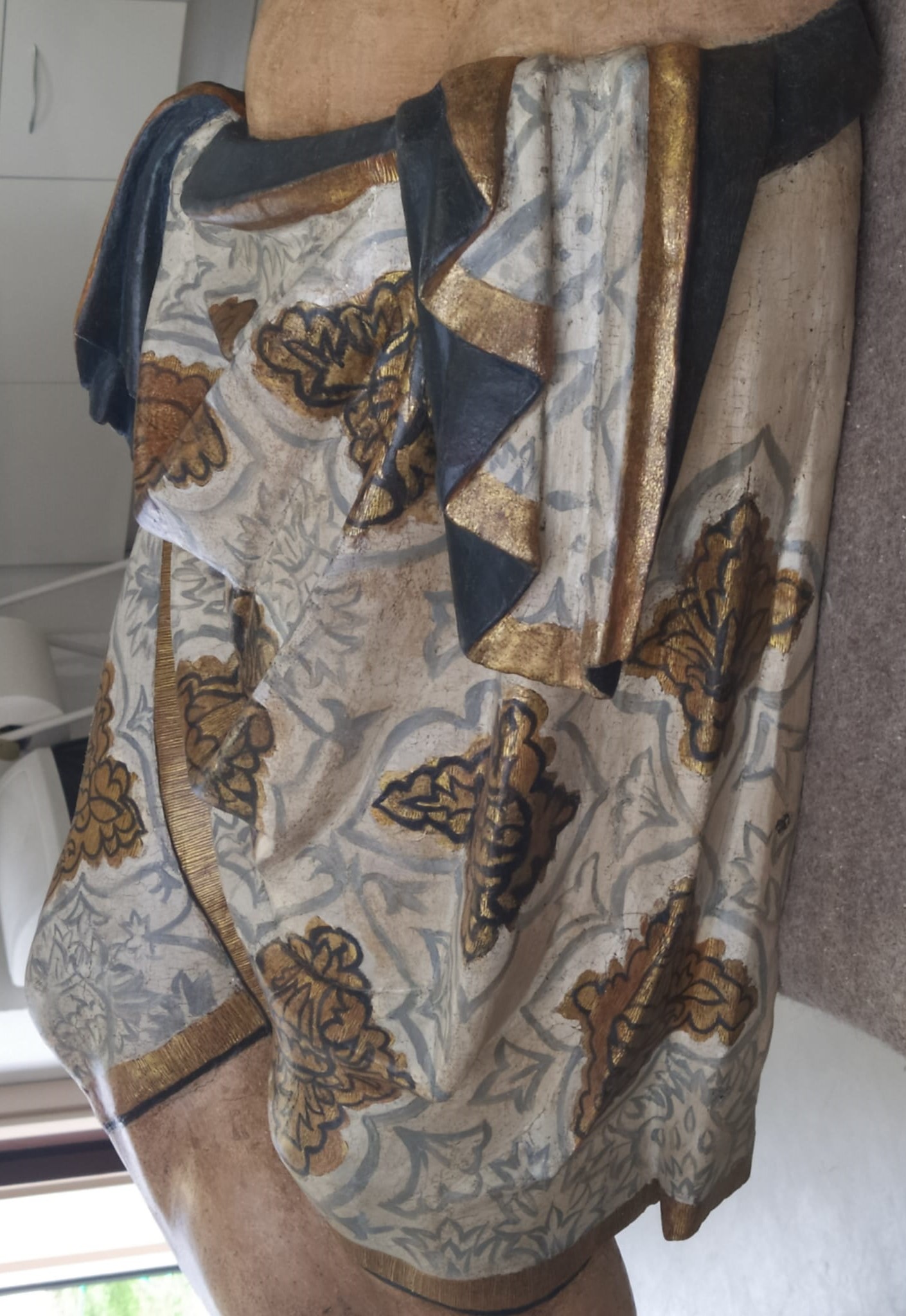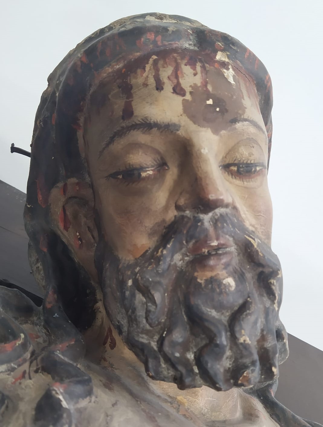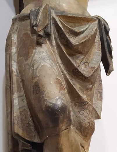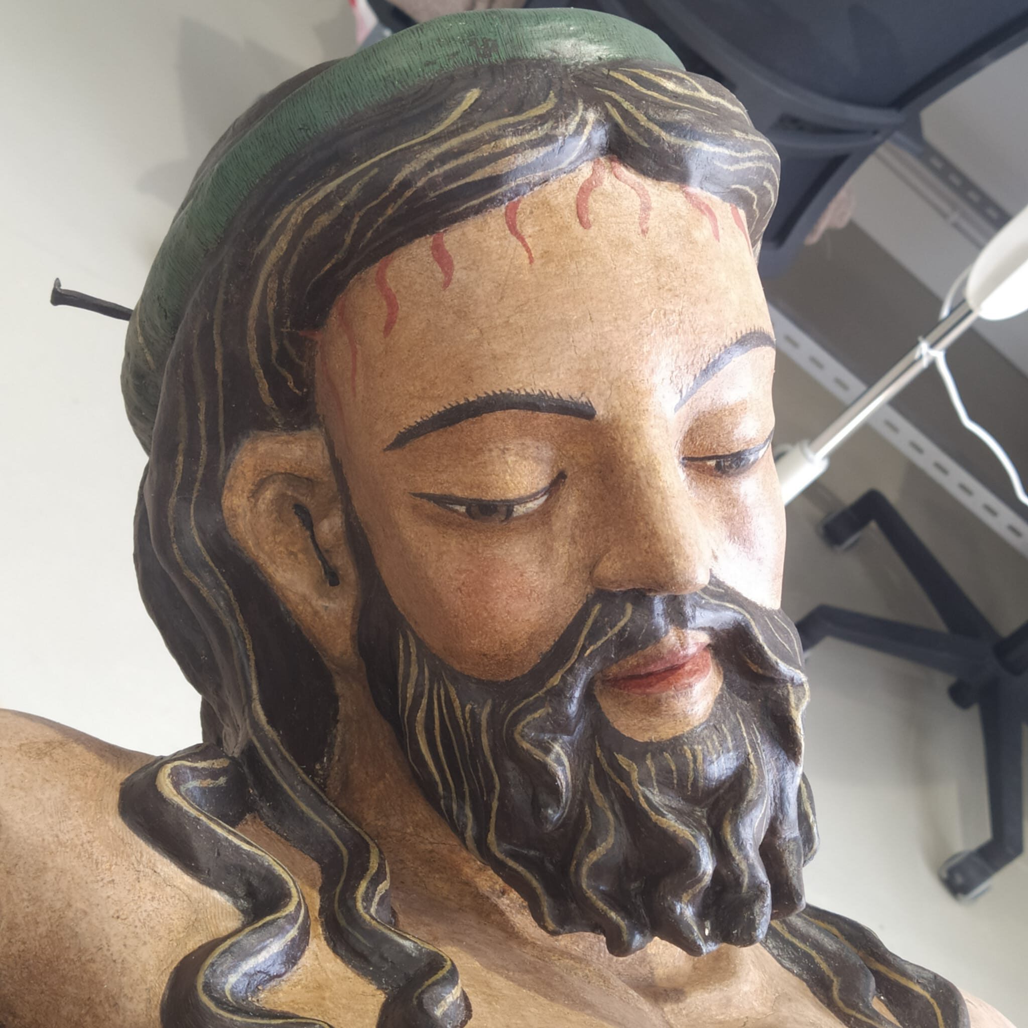 Posteriormente, en el taller de restauración, se realizó un análisis más exhaustivo y detallado de la obra. Se evaluó la estructura interna y soporte de la talla, y el estudio de la capa pictórica con técnicas de estratigrafía para identificar capas superpuestas y áreas de repintado, así como análisis microscópicos para identificar pigmentos y materiales de pintura originales.