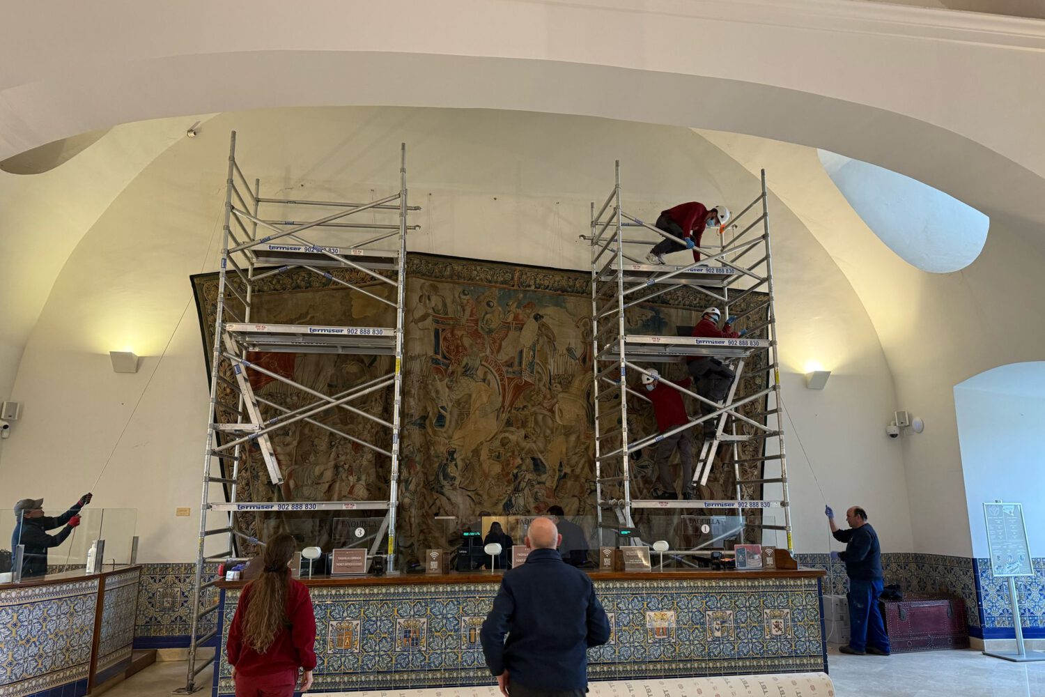 Tres de los magníficos tapices que se exhiben en el Alcázar de Segovia han sido esta mañana desmontados y embalados con destino a la Real Fábrica de Tapices para ser sometidos a una completa restauración. Las obras serán sometidas a un completo proceso de restauración: limpieza, protección y refuerzo —en las zonas que sea necesario—, lavado por inmersión, consolidación mediante soportes auxiliares, así como tratamiento de las intervenciones históricas.